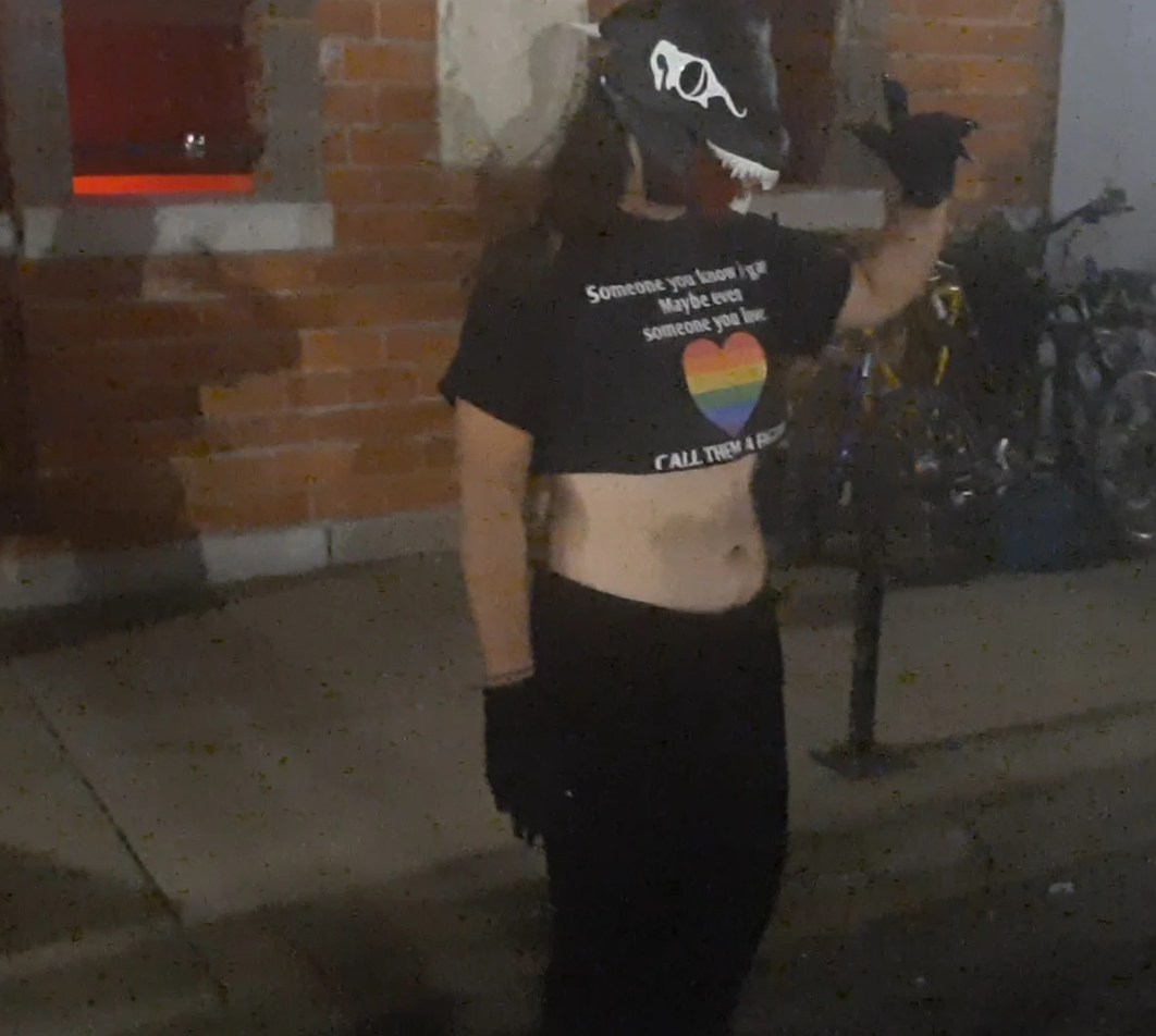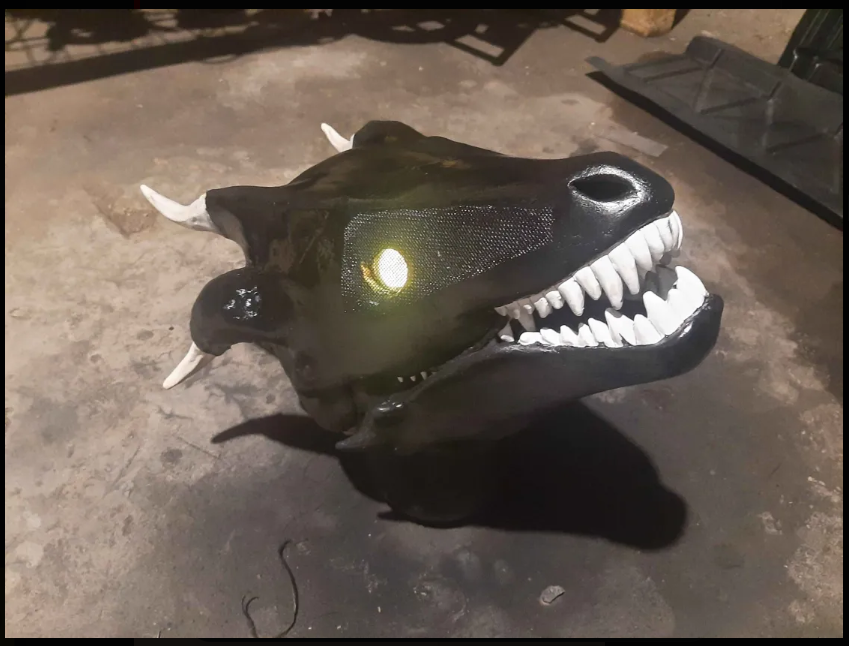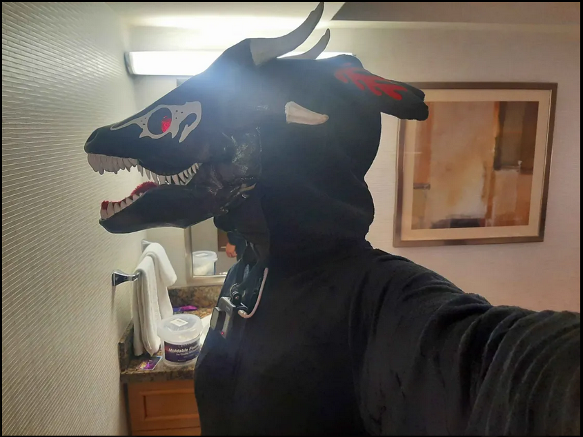I already had a mask that I modified from a latex dragon skull mask and wore to the St. Louis Naked Bike Ride that was the base for this design. I trimmed down some of the little horns is had and used gaffers tape and a thin layer of foam to give it better shape. “RRANYF Dino Mask Moving Jaw Decor - Tyrannosaurus Rex” $30 Amazon, latex (says PLA but lies)