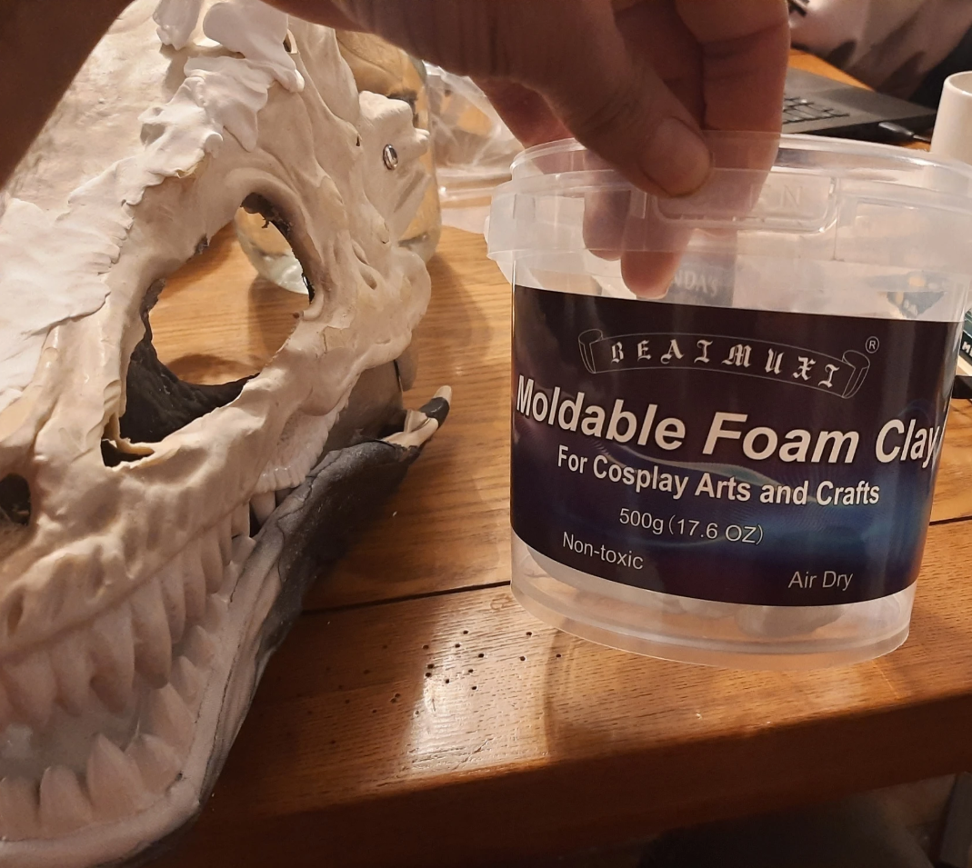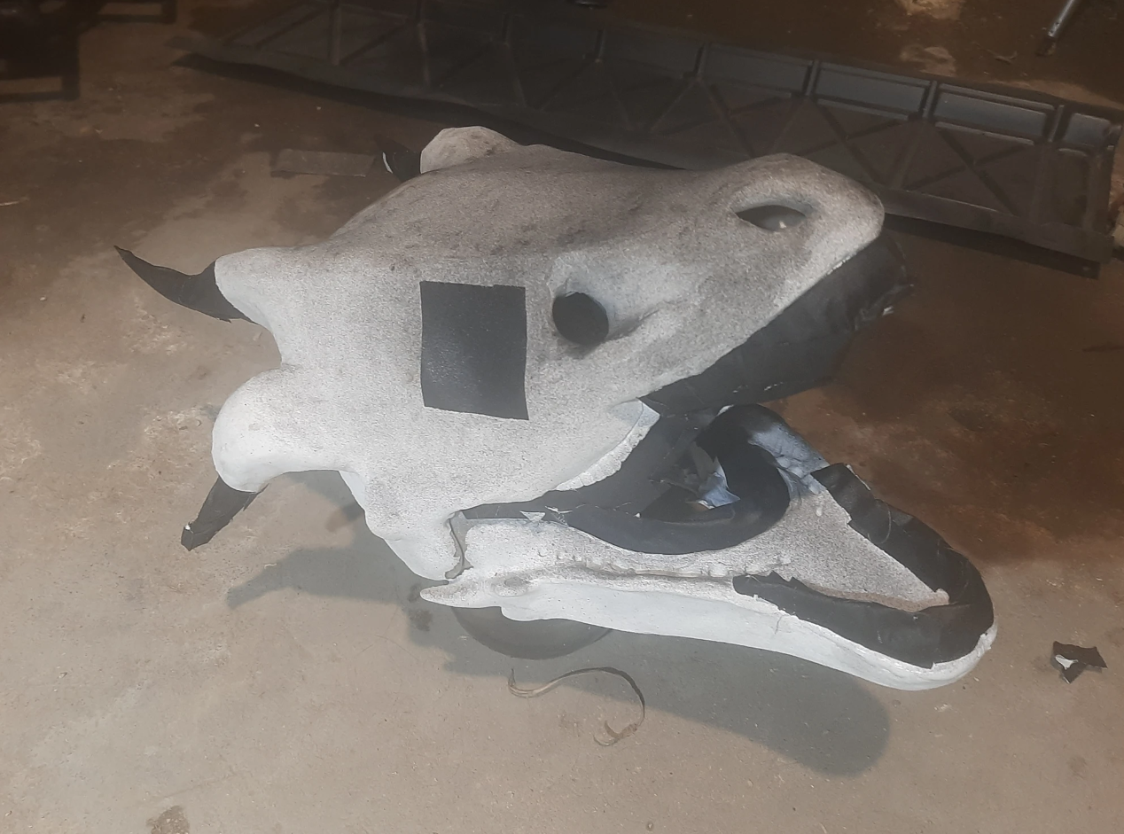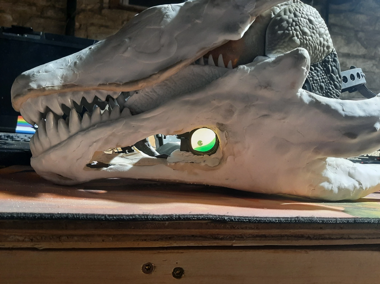 Around this point I decided to ditch the gaffers tape and foam layer so I could mold the shape more effectively. This also helped with the jaw structure and relocating the digital eyes.