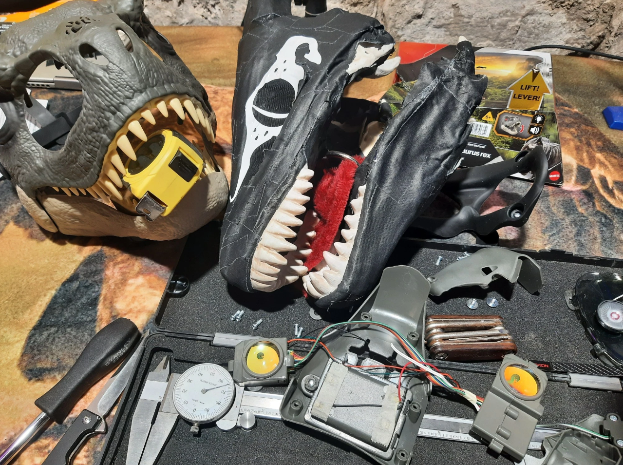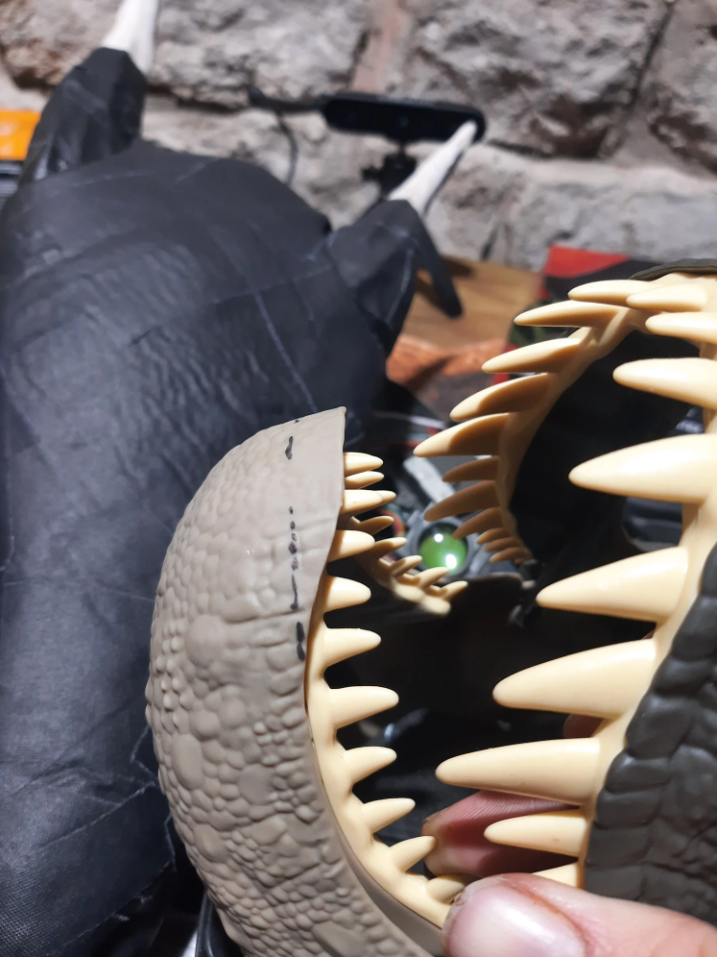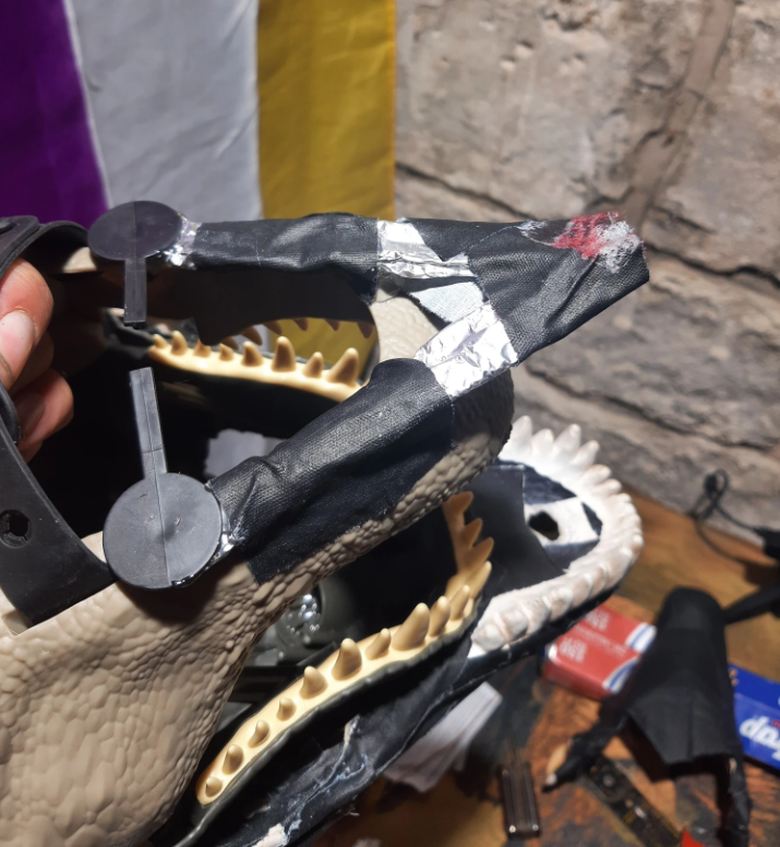 I started by dissecting the latex mask a bit, removed the jaw. Then I liberated the digital eyes from the dino mask and cut the speaker off to mute it.