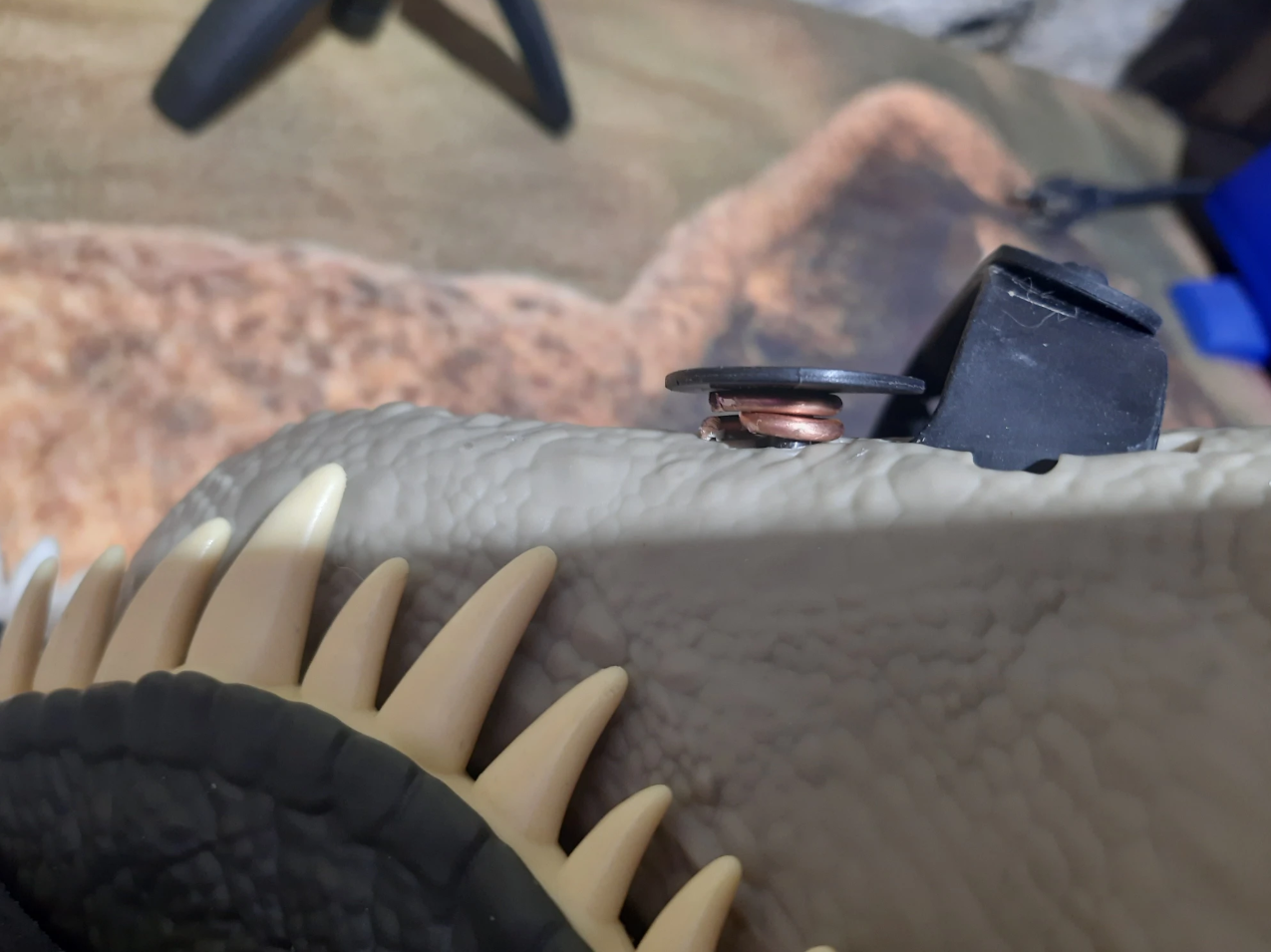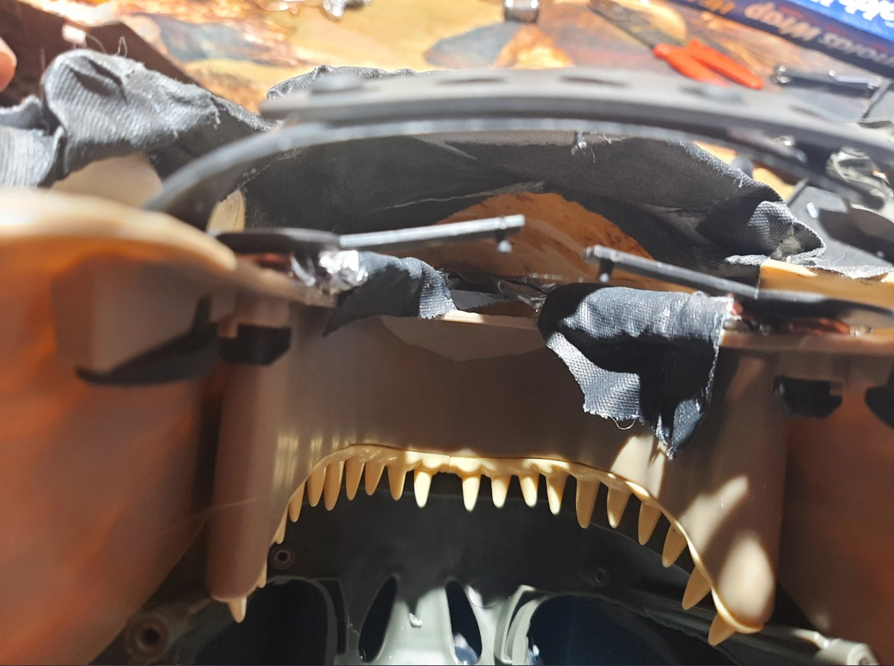 These plastic clips were used to hold the dino mask in the packaging, and I repurposed them into mounts for the jaw strengthening structure. Romex wire worked to lock them in place.