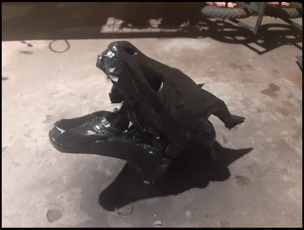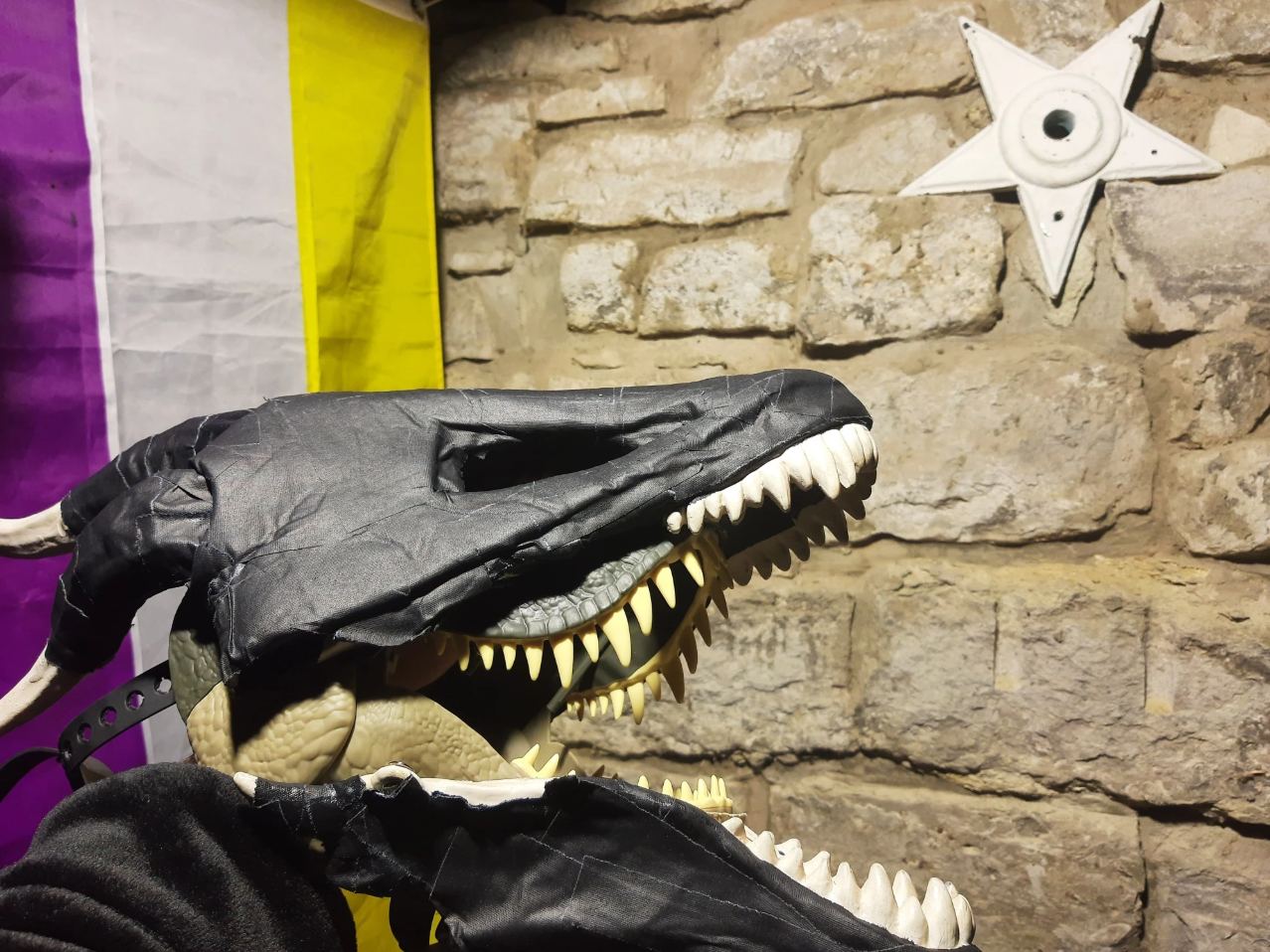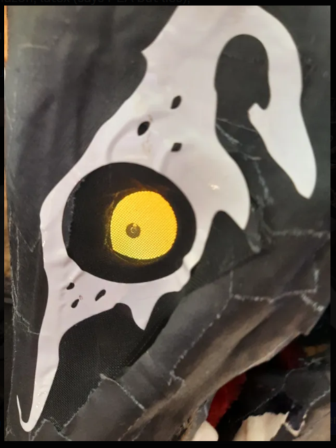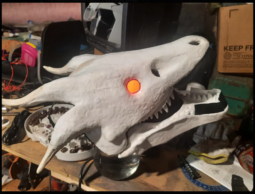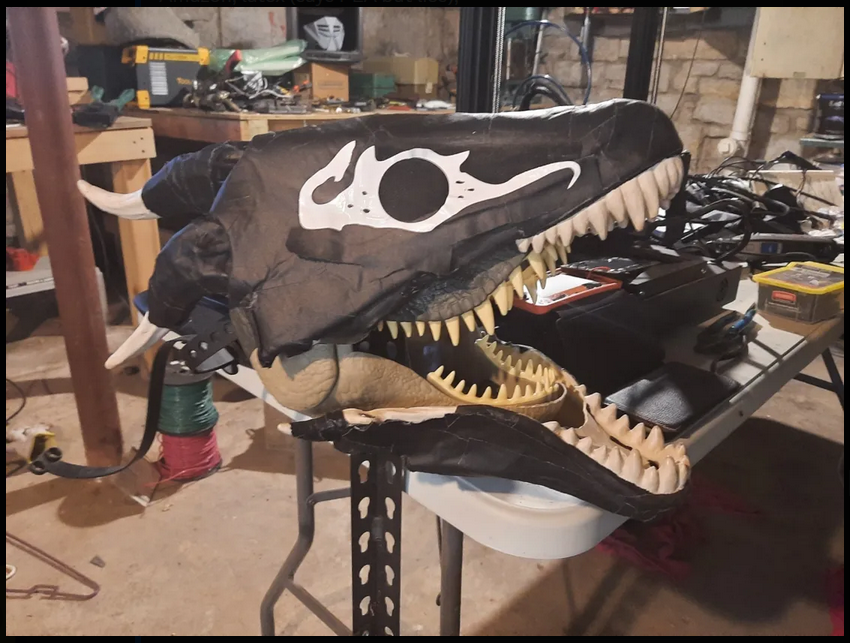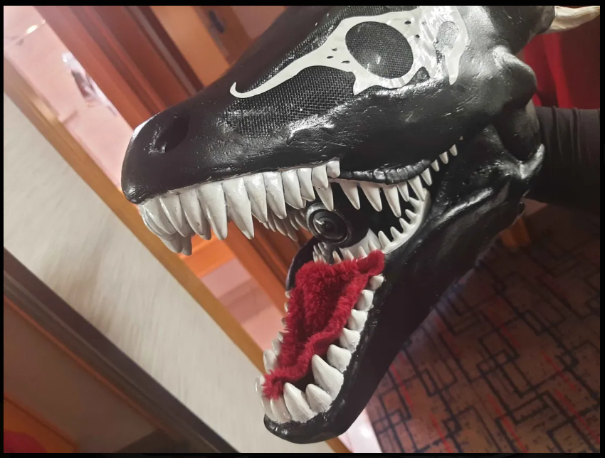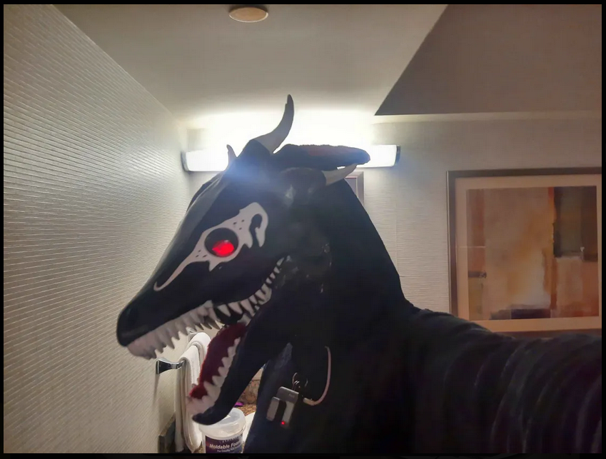 I already had a mask that I modified from a latex dragon skull mask and wore to the St. Louis Naked Bike Ride that was the base for this design. I trimmed down some of the little horns is had and used gaffers tape and a thin layer of foam to give it better shape. “RRANYF Dino Mask Moving Jaw Decor - Tyrannosaurus Rex” $30 Amazon, latex (says PLA but lies)