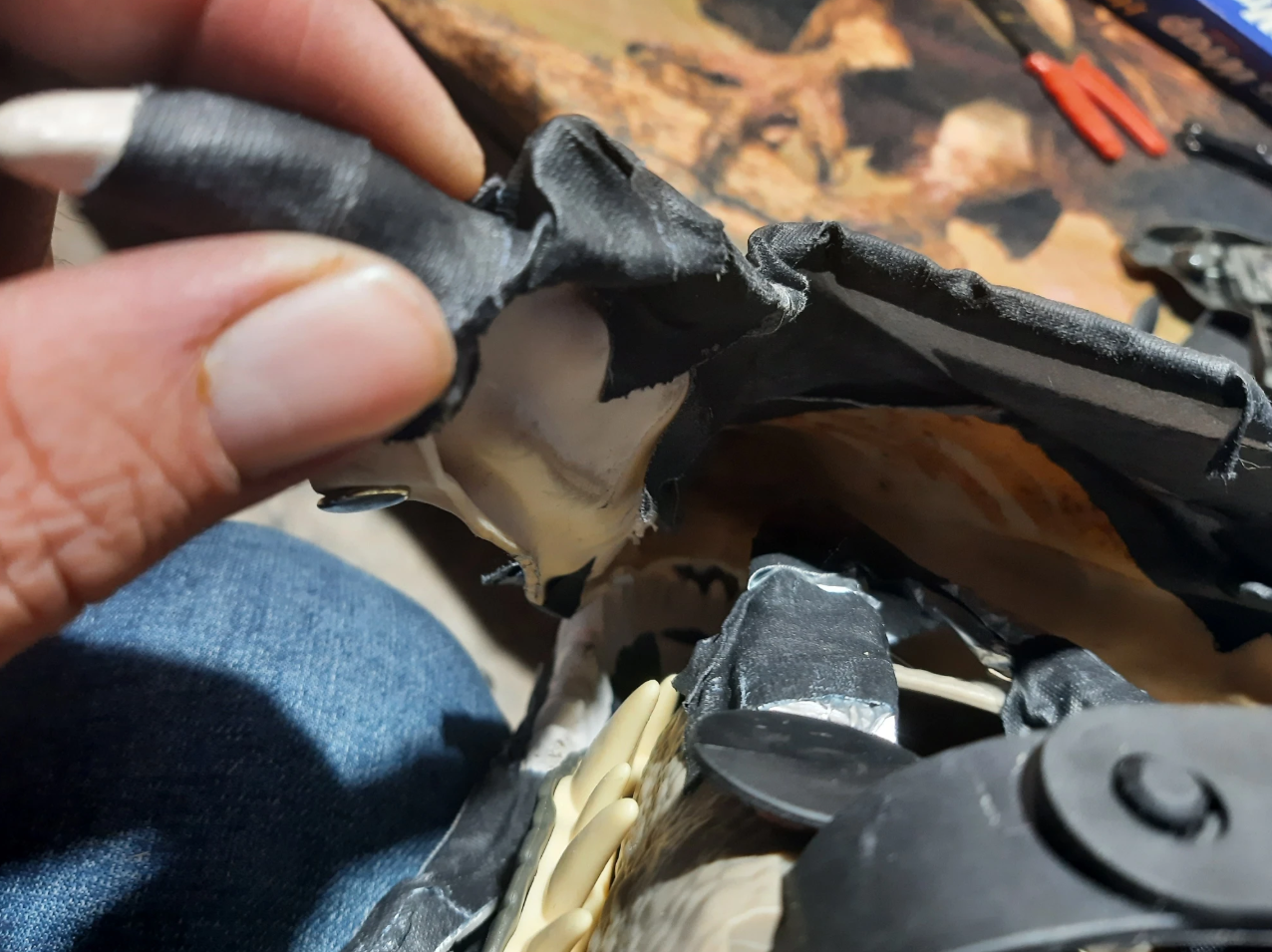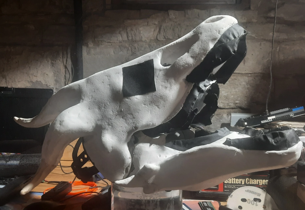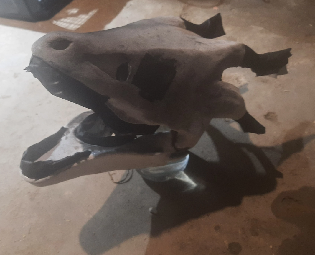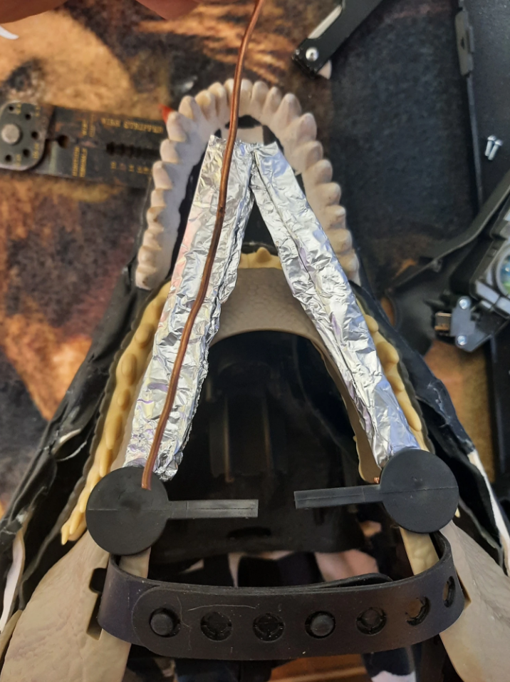 Around this point I decided to ditch the gaffers tape and foam layer so I could mold the shape more effectively. This also helped with the jaw structure and relocating the digital eyes.