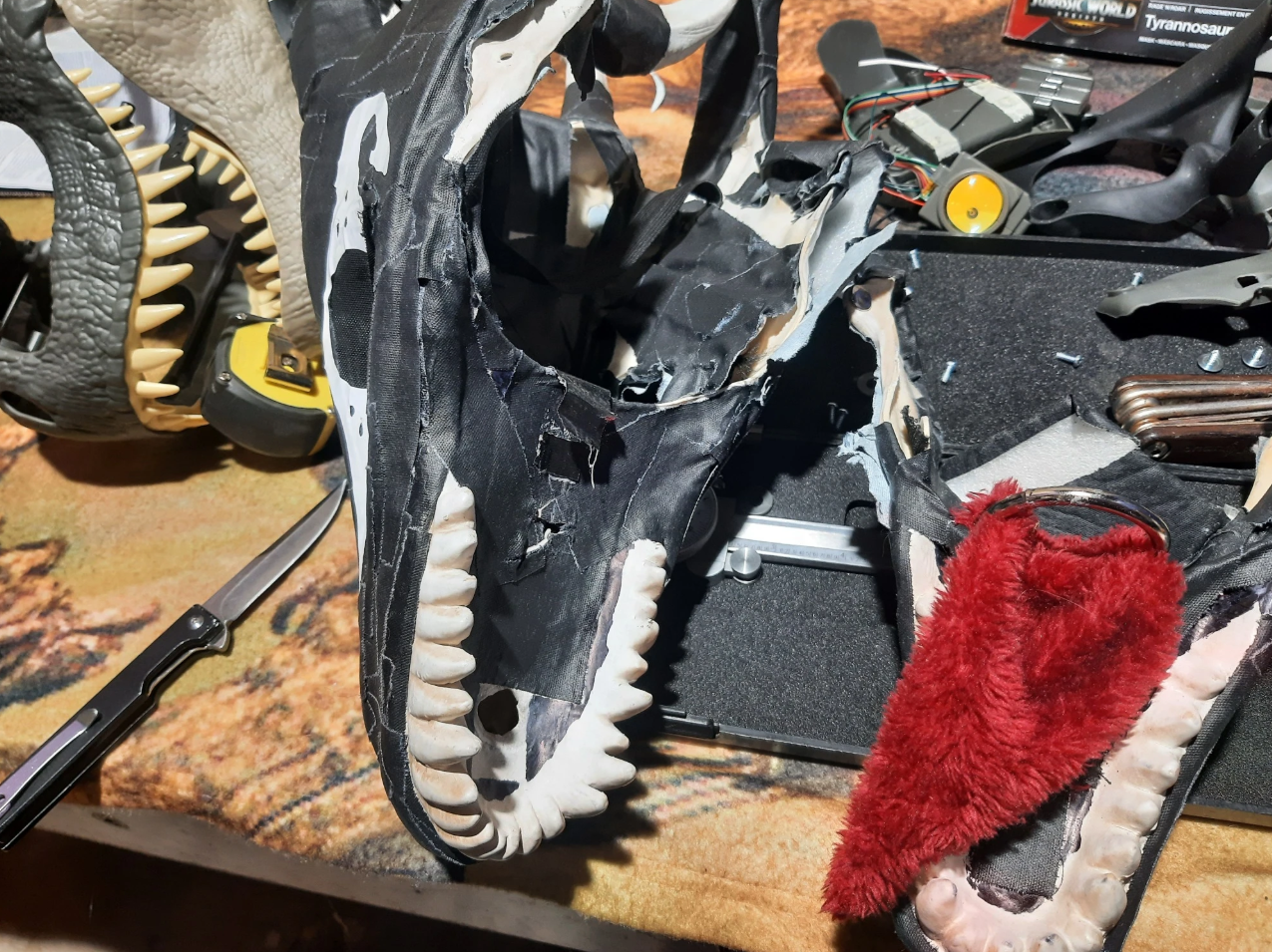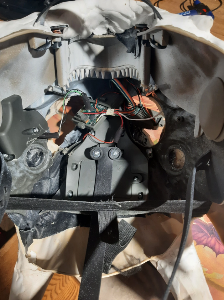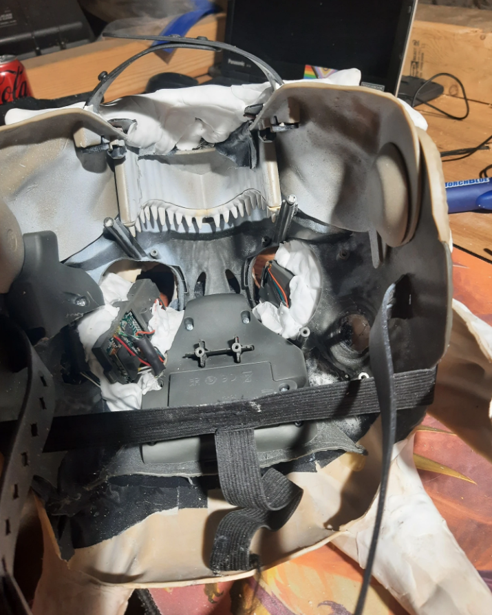 I started by dissecting the latex mask a bit, removed the jaw. Then I liberated the digital eyes from the dino mask and cut the speaker off to mute it.