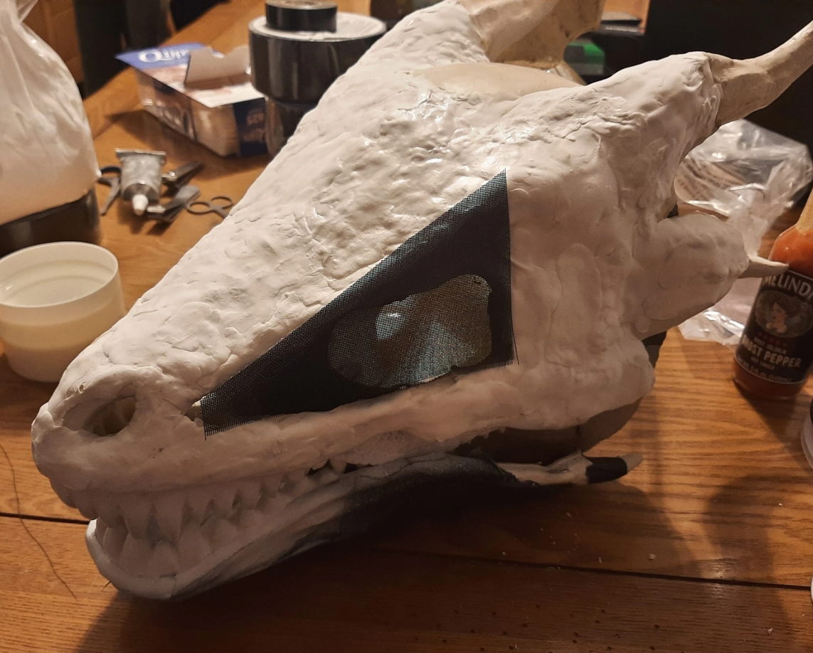 I used plastic door screen to cover the view ports and digital eyes. Painting was a tedious process, after I had the sculpting mostly where I wanted it I covered the eyes, horns, and teeth with gaffers tape and began layering black Krylon Fusion spray paint.