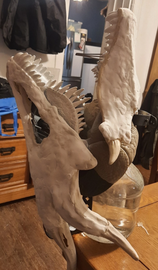 Next I began to test fit the merging of these 2 masking into one..thing. I used a drimmel to remove material from the dino mask so it fit inside and supported the latex mask in the right areas.