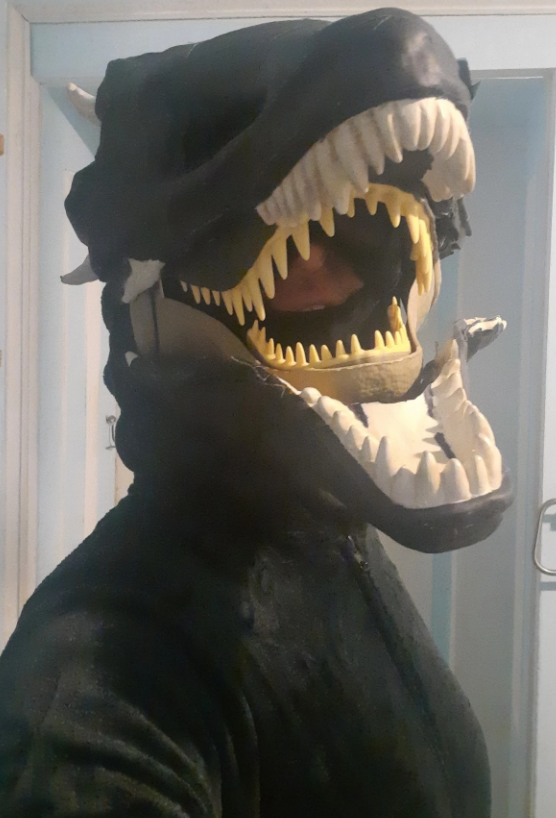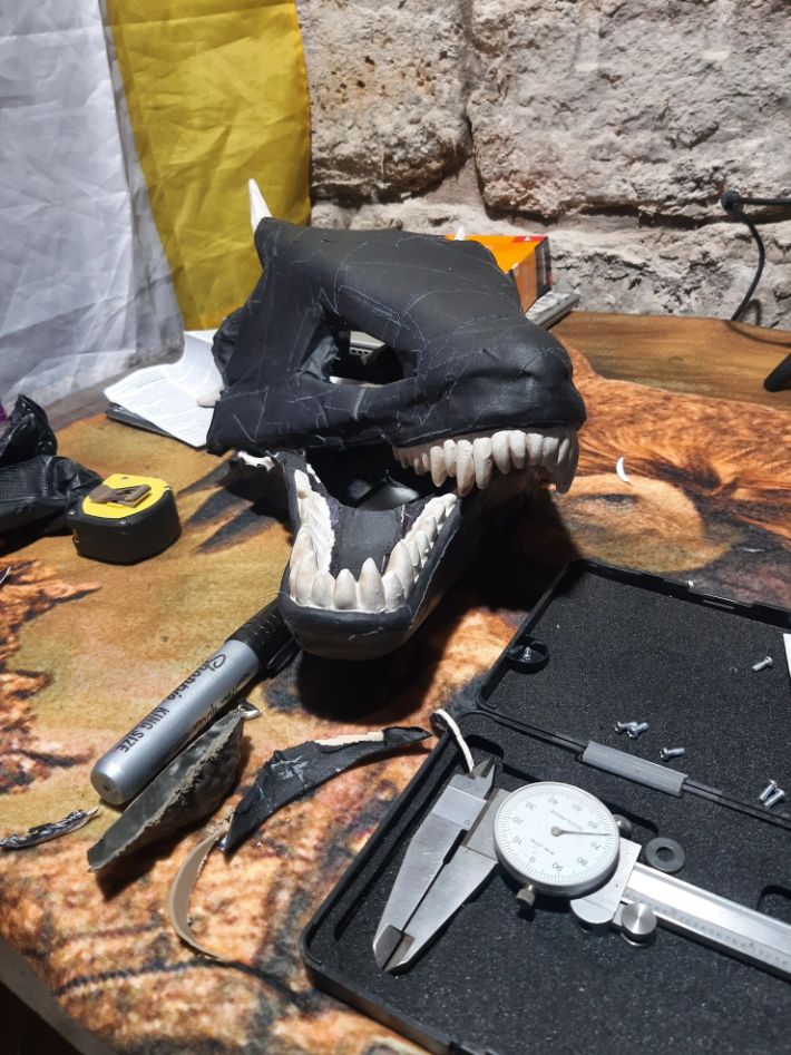 Next I decided to trim the bottom lip on the dino mask a bit to show the teeth better. This was a point where the character design followed the build process because the decision to keep the inner row of teeth effectively gave the mask a double jaw, a bit like a moray eel.