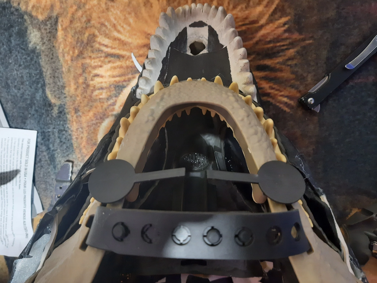 These plastic clips were used to hold the dino mask in the packaging, and I repurposed them into mounts for the jaw strengthening structure. Romex wire worked to lock them in place.
